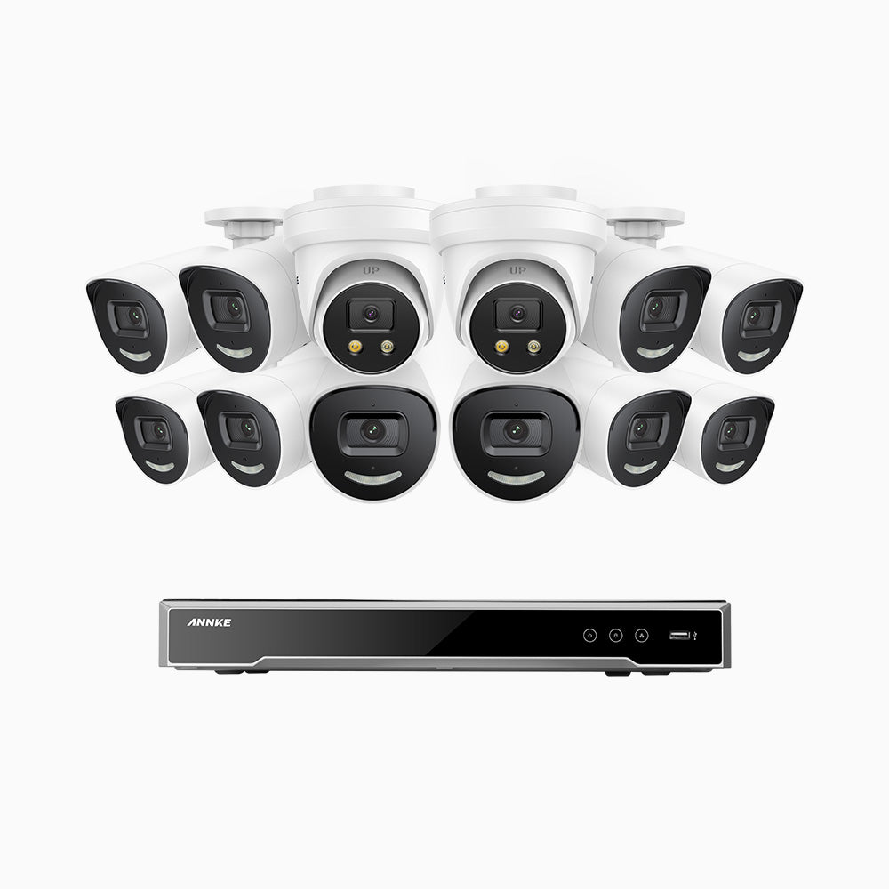 H800X - 4K 16 Channel PoE Security System with 10 Bullet & 2 Turret Cameras, 1/1.8'' BSI Sensor, f/1.6 Aperture (0.003 Lux), Siren & Strobe Alarm, 2CH 4K Decoding Capability, Human & Vehicle Detection, Perimeter Protection, All-Metal Housing