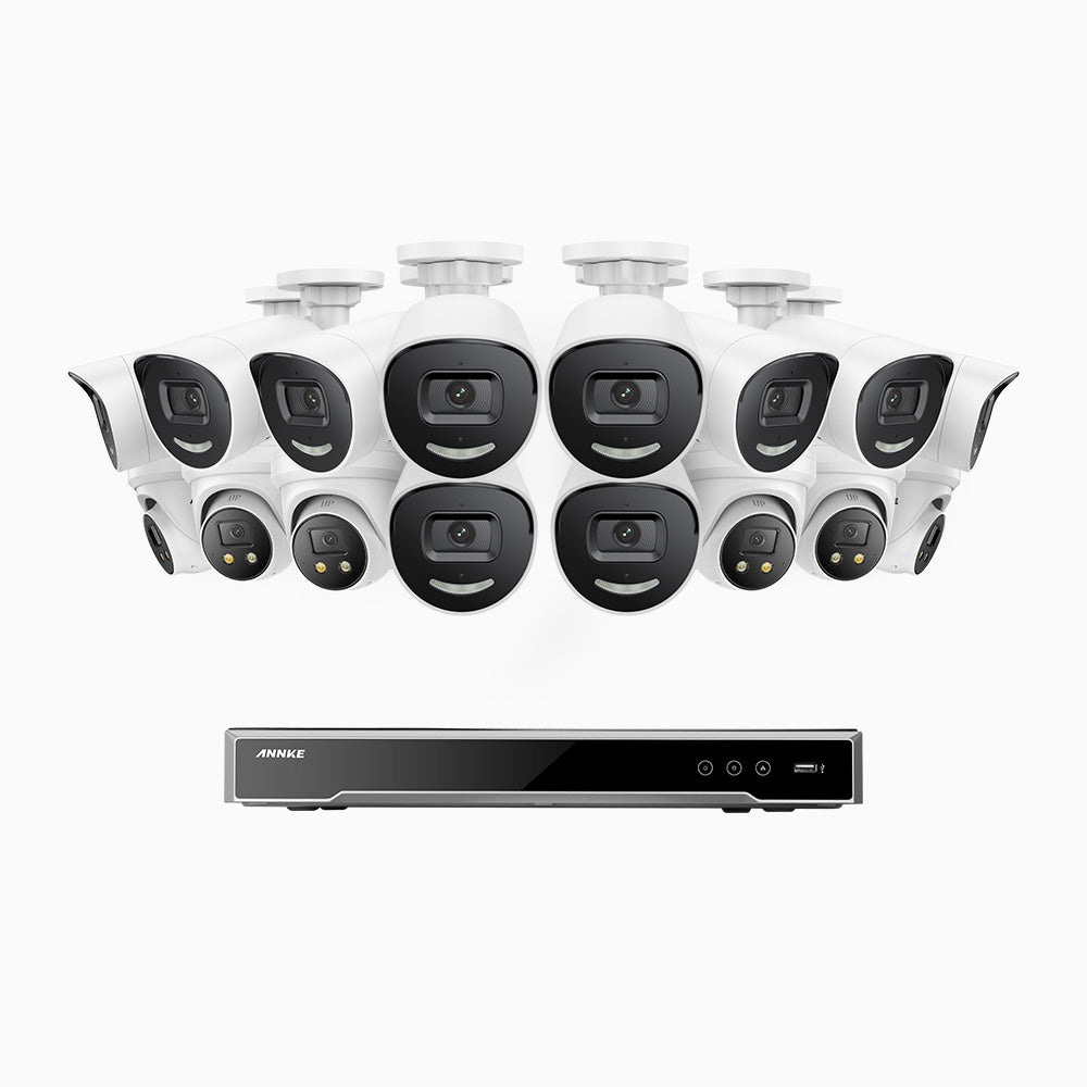 H800X - 4K 16 Channel PoE Security System with 10 Bullet & 6 Turret Cameras, 1/1.8'' BSI Sensor, f/1.6 Aperture (0.003 Lux), Siren & Strobe Alarm, 2CH 4K Decoding Capability, Human & Vehicle Detection, Perimeter Protection, All-Metal Housing