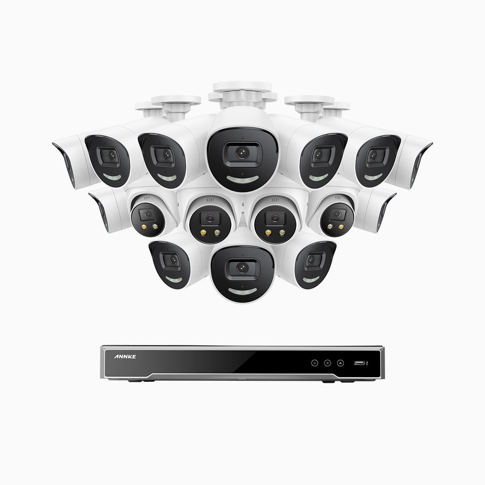 H800X - 4K 16 Channel PoE Security System with 12 Bullet & 4 Turret Cameras, 1/1.8'' BSI Sensor, f/1.6 Aperture (0.003 Lux), Siren & Strobe Alarm, 2CH 4K Decoding Capability, Human & Vehicle Detection, Perimeter Protection, All-Metal Housing