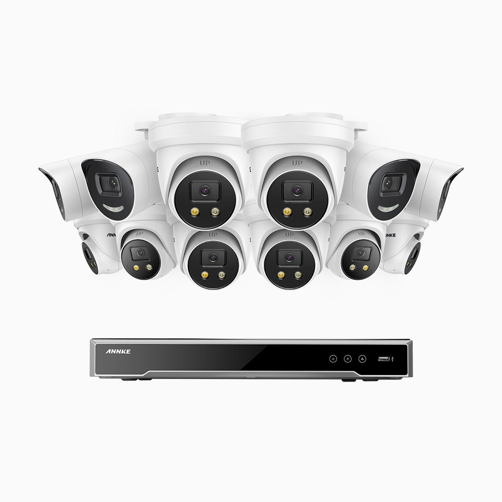 H800X - 4K 16 Channel PoE Security System with 4 Bullet & 8 Turret Cameras, 1/1.8'' BSI Sensor, f/1.6 Aperture (0.003 Lux), Siren & Strobe Alarm, 2CH 4K Decoding Capability, Human & Vehicle Detection, Perimeter Protection, All-Metal Housing