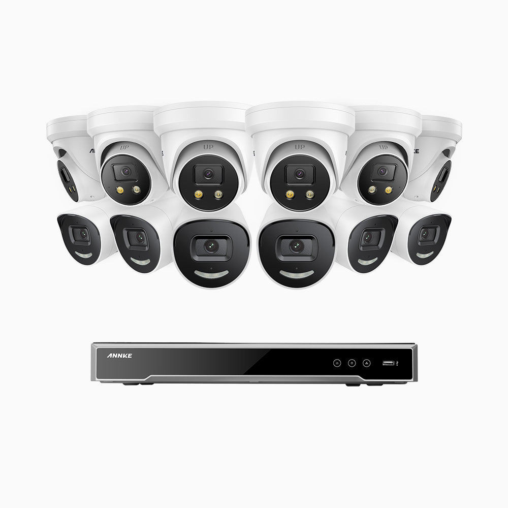 H800X - 4K 16 Channel PoE Security System with 6 Bullet & 6 Turret Cameras, 1/1.8'' BSI Sensor, f/1.6 Aperture (0.003 Lux), Siren & Strobe Alarm, 2CH 4K Decoding Capability, Human & Vehicle Detection, Perimeter Protection, All-Metal Housing