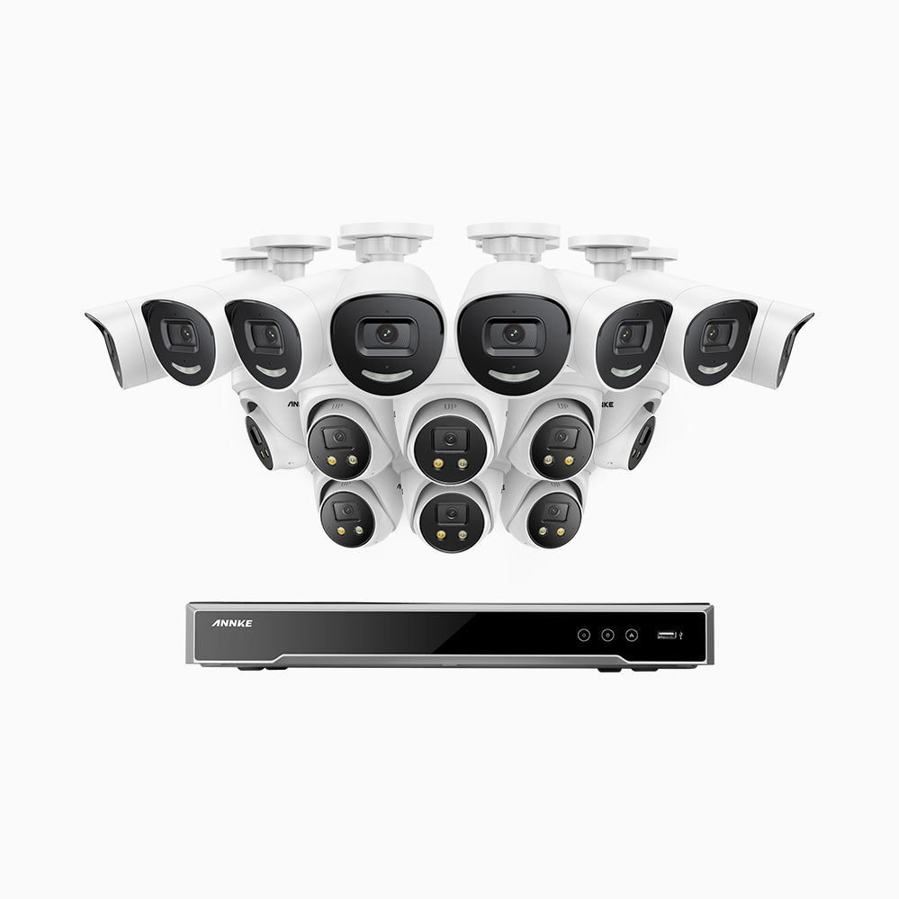 H800X - 4K 16 Channel PoE Security System with 8 Bullet & 8 Turret Cameras, 1/1.8'' BSI Sensor, f/1.6 Aperture (0.003 Lux), Siren & Strobe Alarm, 2CH 4K Decoding Capability, Human & Vehicle Detection, Perimeter Protection, All-Metal Housing