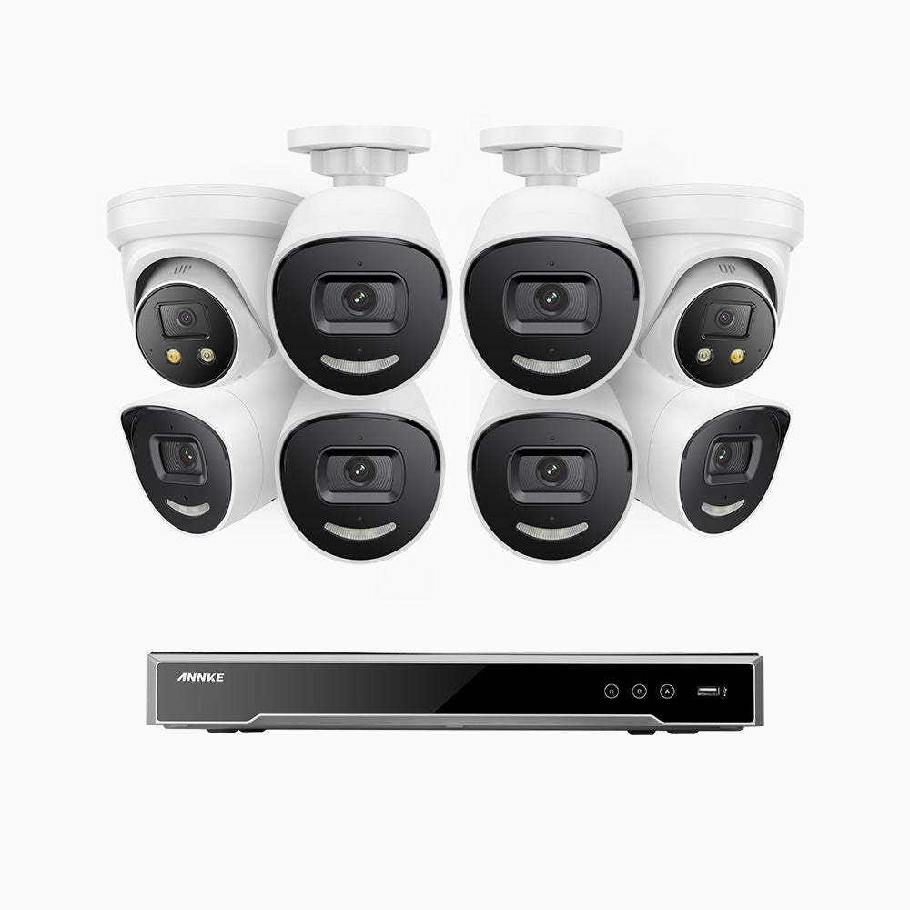 H800X - 4K 8 Channel PoE Security System with 6 Bullet & 2 Turret Cameras, 1/1.8'' BSI Sensor, f/1.6 Aperture (0.003 Lux), Siren & Strobe Alarm, 2CH 4K Decoding Capability, Human & Vehicle Detection, Perimeter Protection, All-Metal Housing