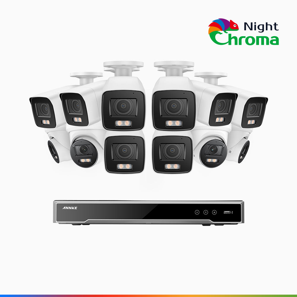 NightChromaTM NCK800 – 4K 16 Channel PoE Security System with 8 Bullet & 4 Turret Cameras, f/1.0 Super Aperture, Colour Night Vision, 2CH 4K Decoding Capability, Human & Vehicle Detection, Intelligent Behavior Analysis, Built-in Mic, 124° FoV